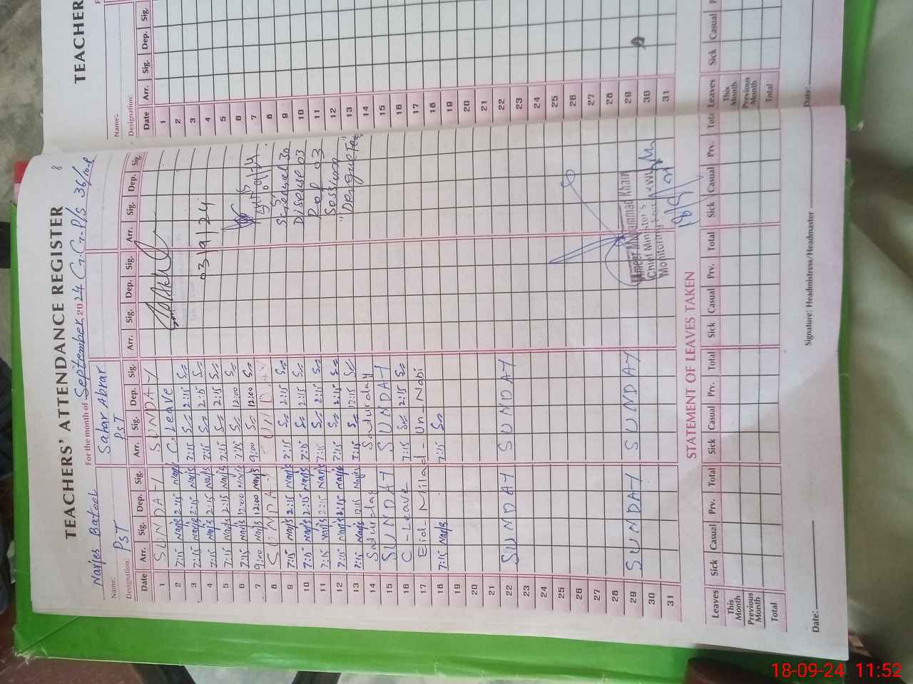 | Name: Na**** Ba**** Designation: (School Headmaster's/Headmistress's) PST Phone/Cell Number: 03**** |