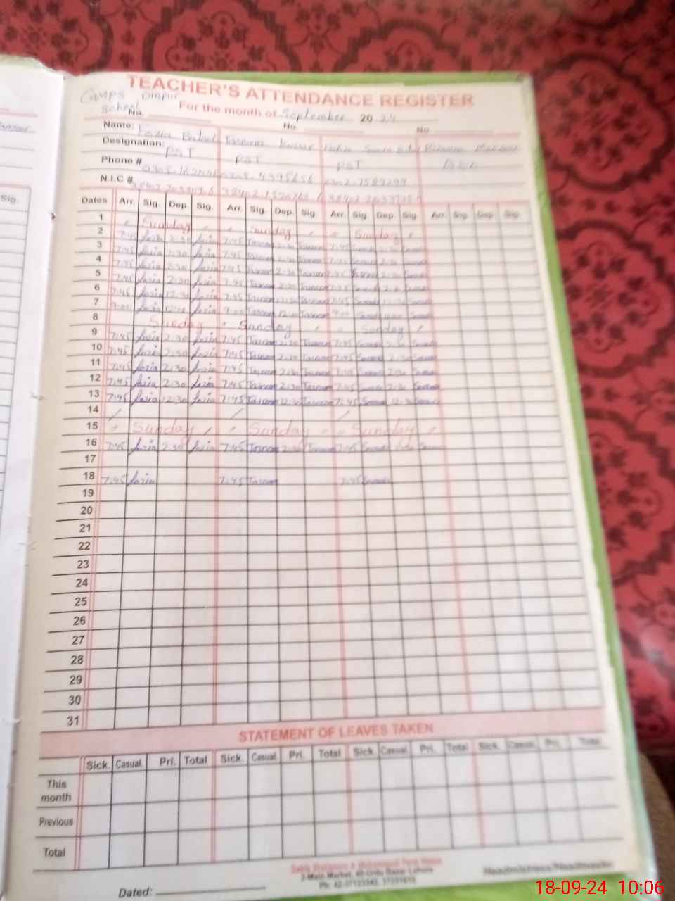 | CNIC | Full Name | Designation | R/C | Absence During Last Calender Month |