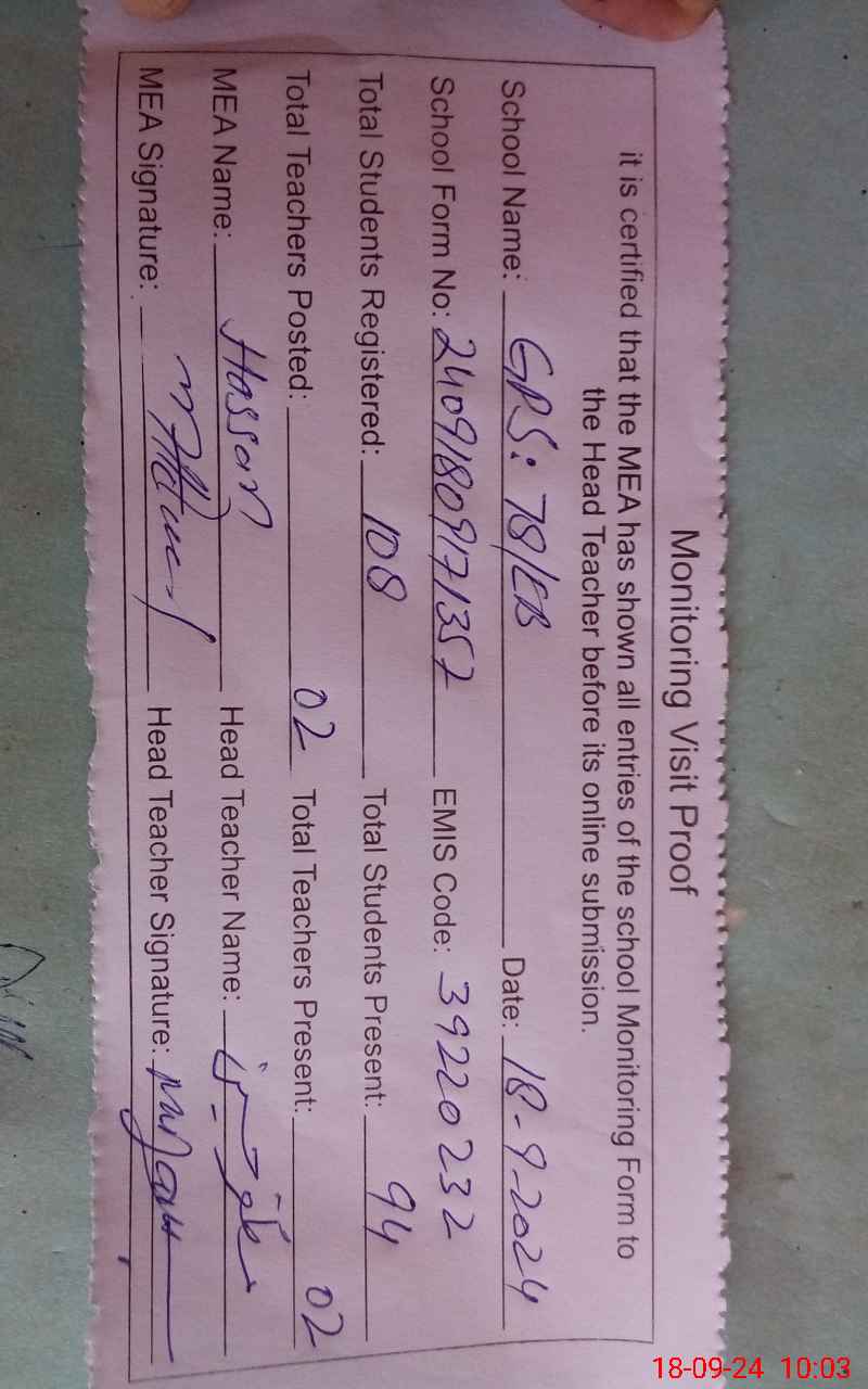 | EMIS Code: 39220232 | Name of School: GPS 78 EB ARIF WALA | |||