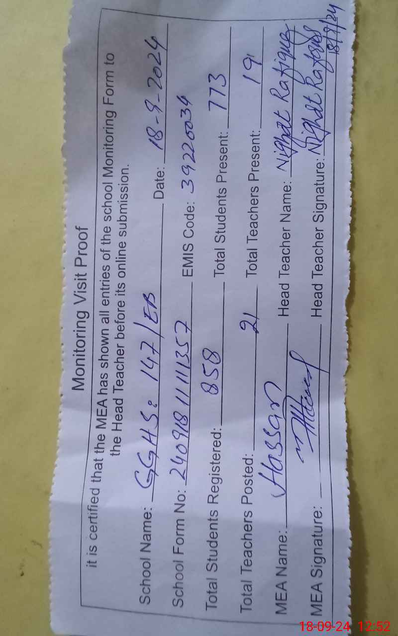 | Attendance Register | Head Teacher | MEA with School | Visit Proof |