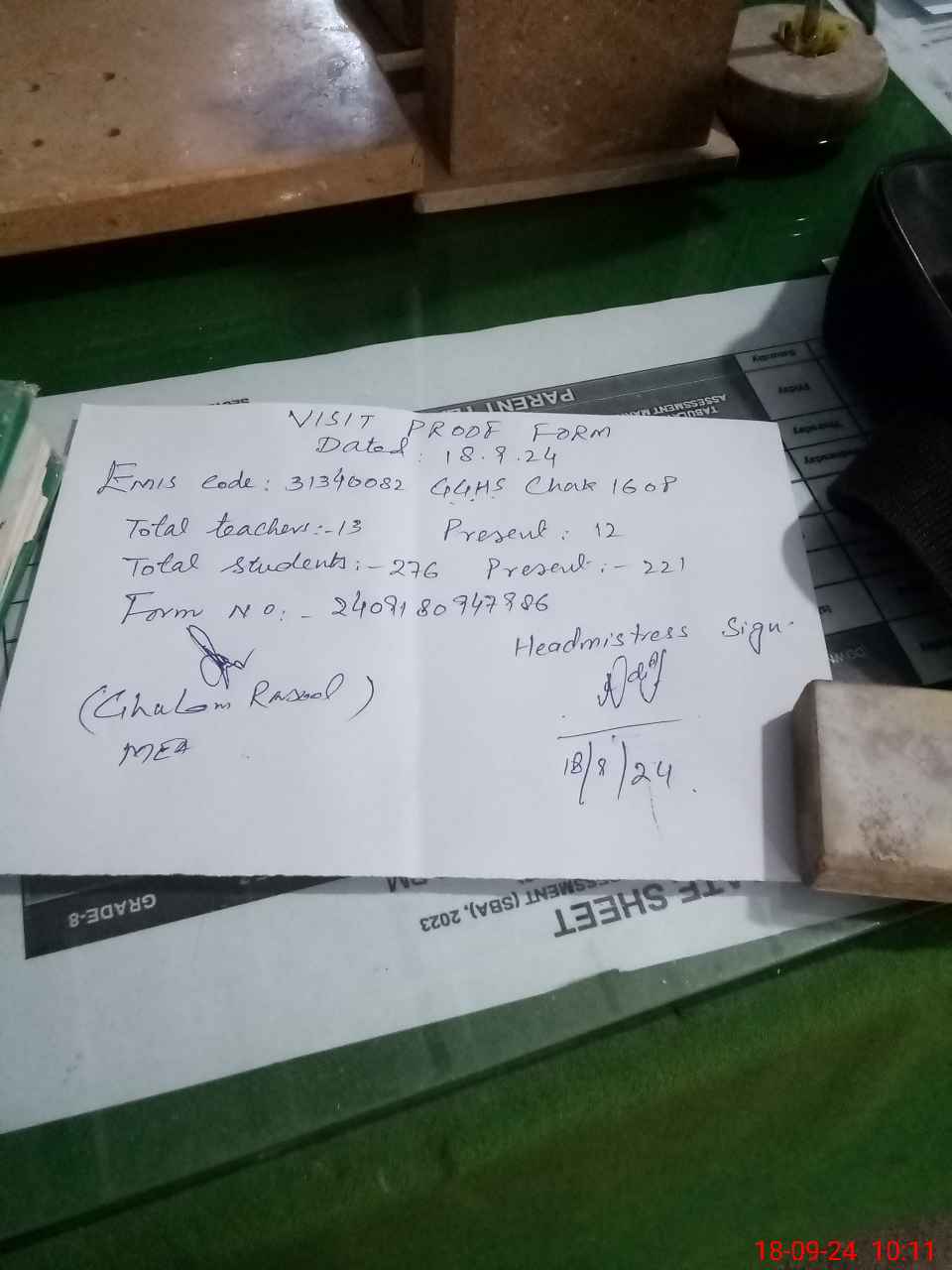 | Attendance Register | Head Teacher | MEA with School | Visit Proof |