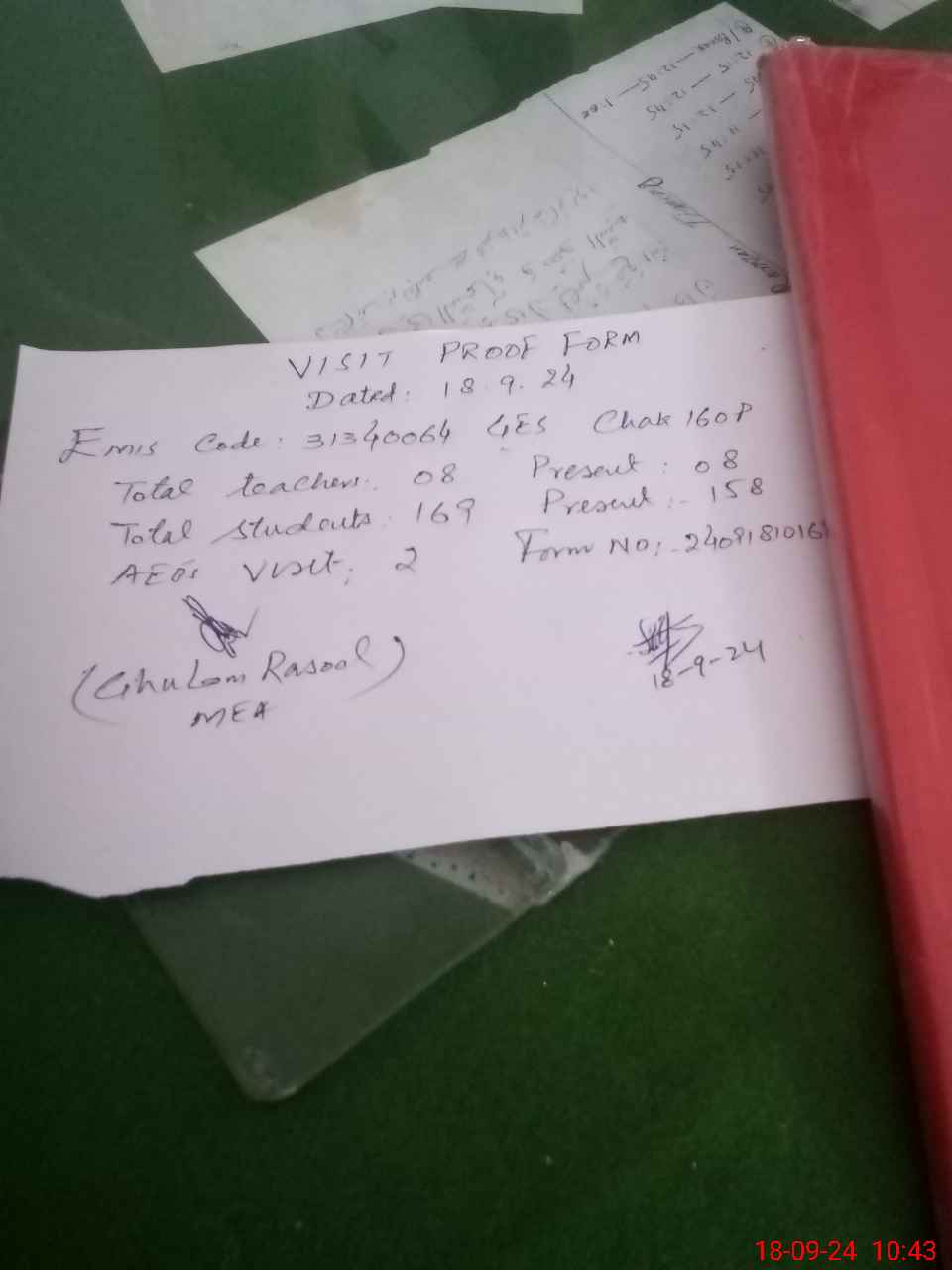 | Attendance Register | Head Teacher | MEA with School | Visit Proof |