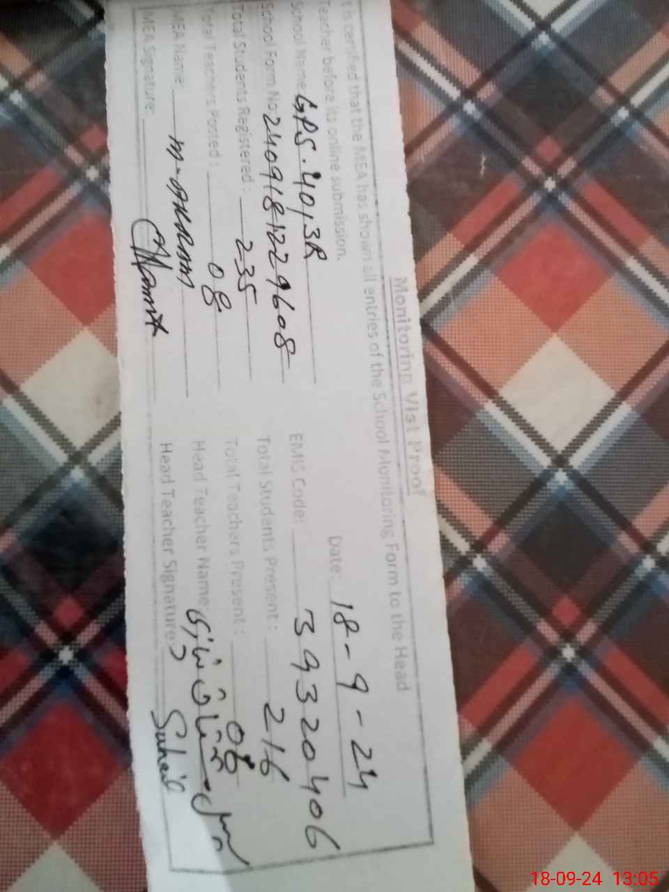 | Attendance Register | Head Teacher | MEA with School | Visit Proof |