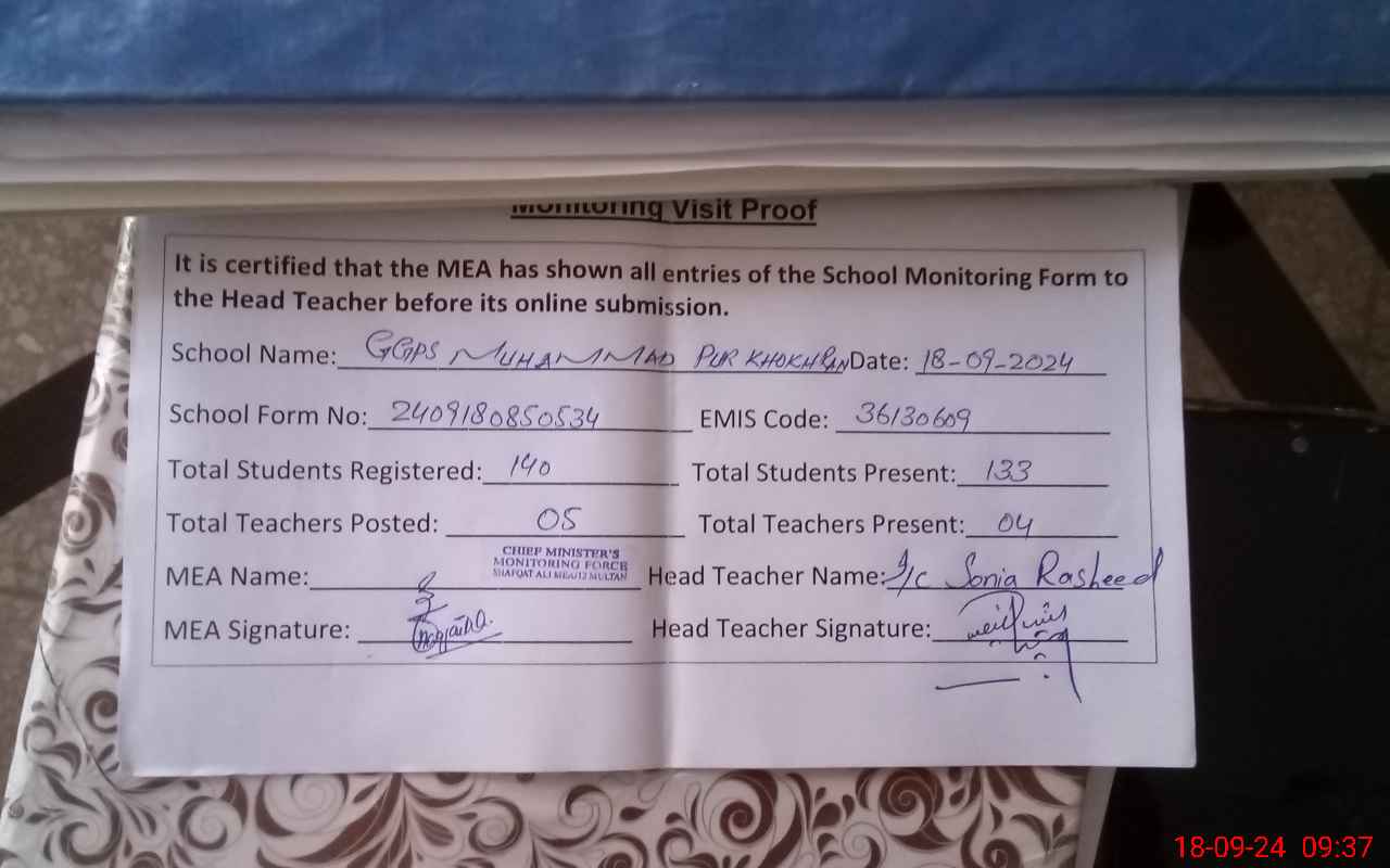 | EMIS Code: 36130609 | Name of School: GGPS MUHAMMAD PUR KHOKHAR | |||