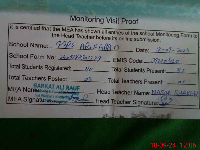 | EMIS Code: 39210420 | Name of School: GGPS ARIF ABAD | |||