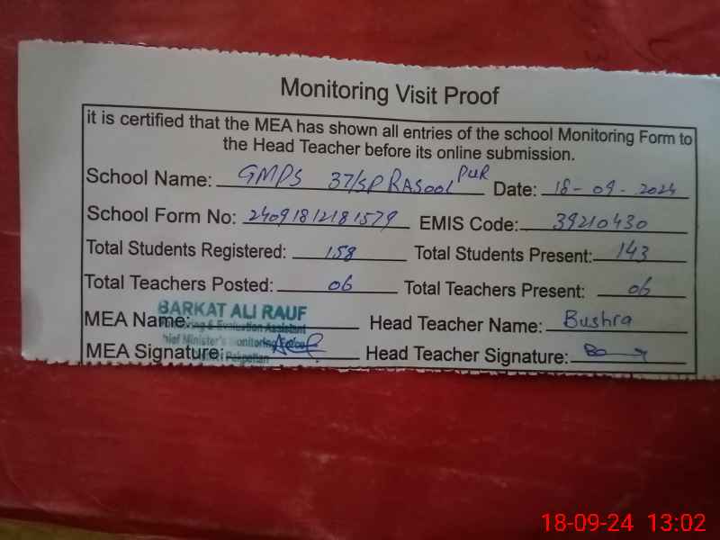 | EMIS Code: 39210430 | Name of School: GMPS CHAK 37/SP RASOOL PUR | |||