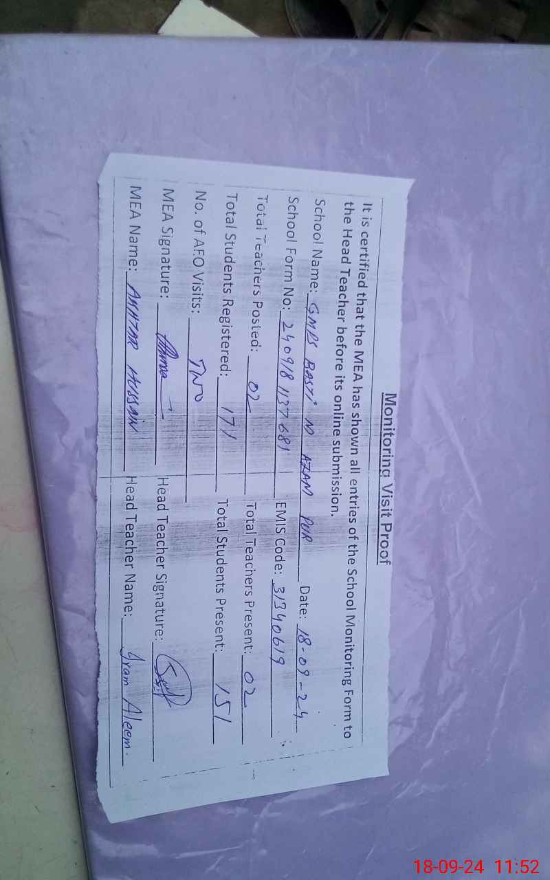 | EMIS Code: 31340619 | Name of School: GMPS BASTI MUHAMMAD AZAM | |||