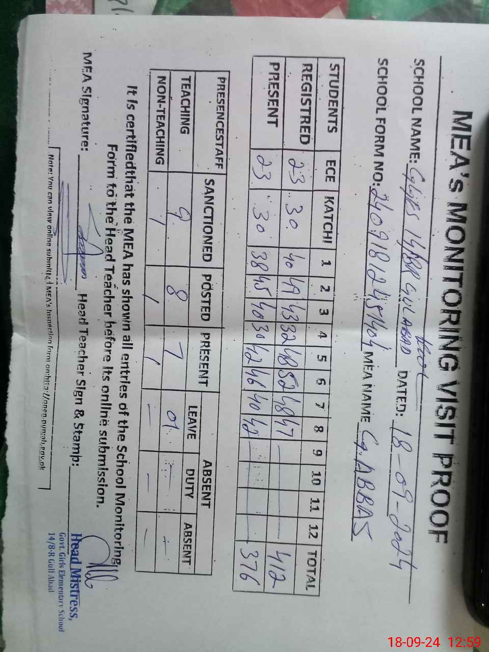 | Attendance Register | Head Teacher | MEA with School | Visit Proof |
