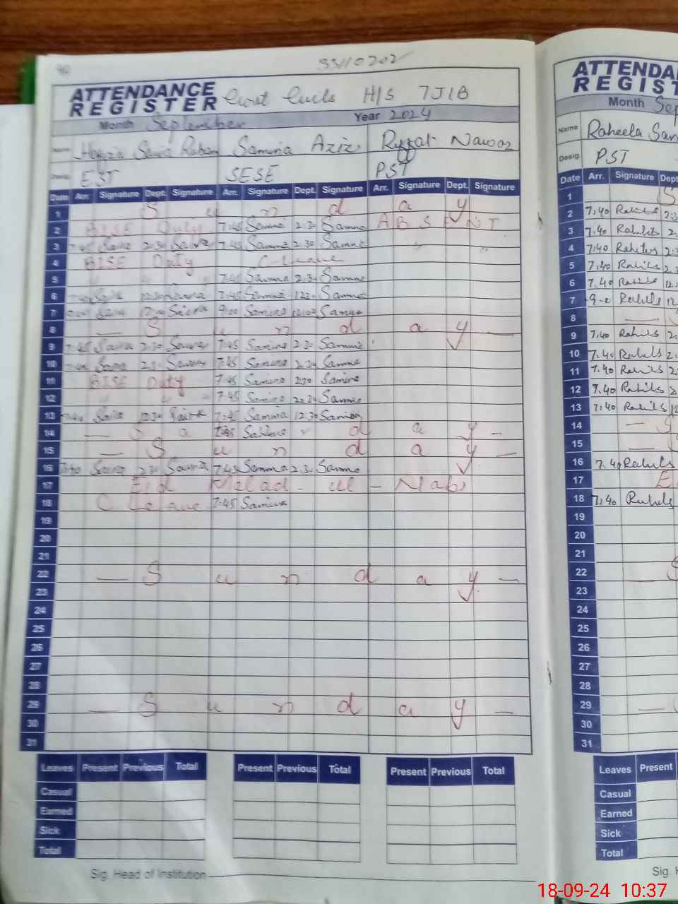 | Remarks (Use Separate Page if Required): Mrs Riffat Nawaz PST found absent from school since 08 august 2024 | |||||