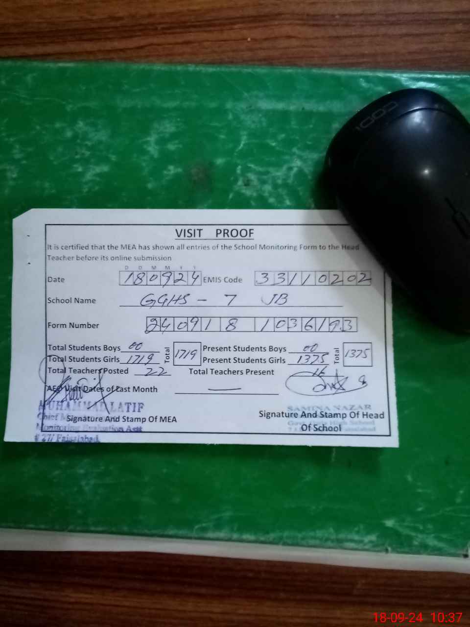 | Attendance Register | Head Teacher | MEA with School | Visit Proof |