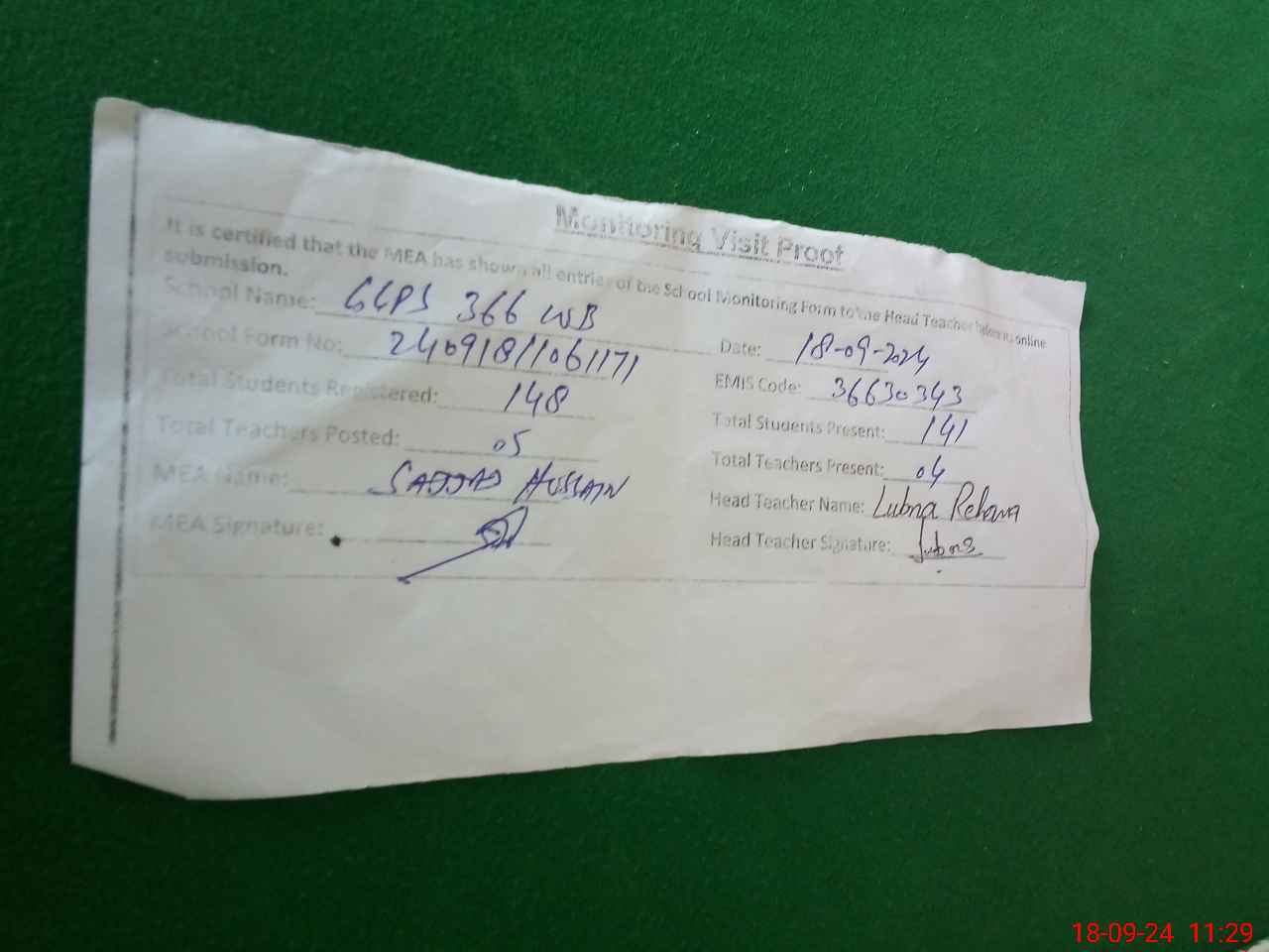 | Attendance Register | Head Teacher | MEA with School | Visit Proof |