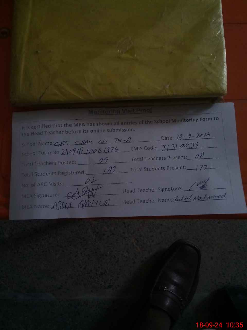 | Attendance Register | Head Teacher | MEA with School | Visit Proof |