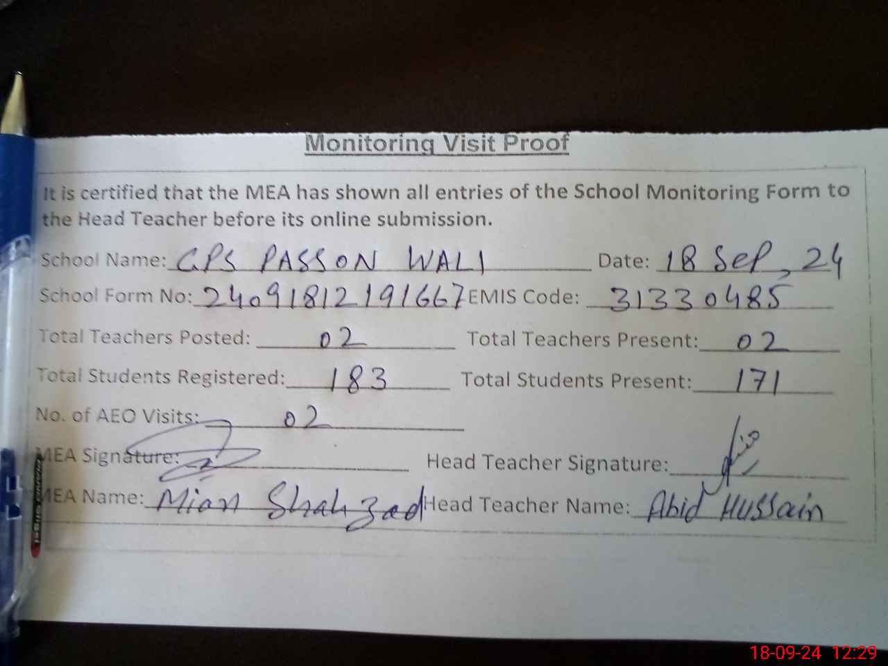| Attendance Register | Head Teacher | MEA with School | Visit Proof |