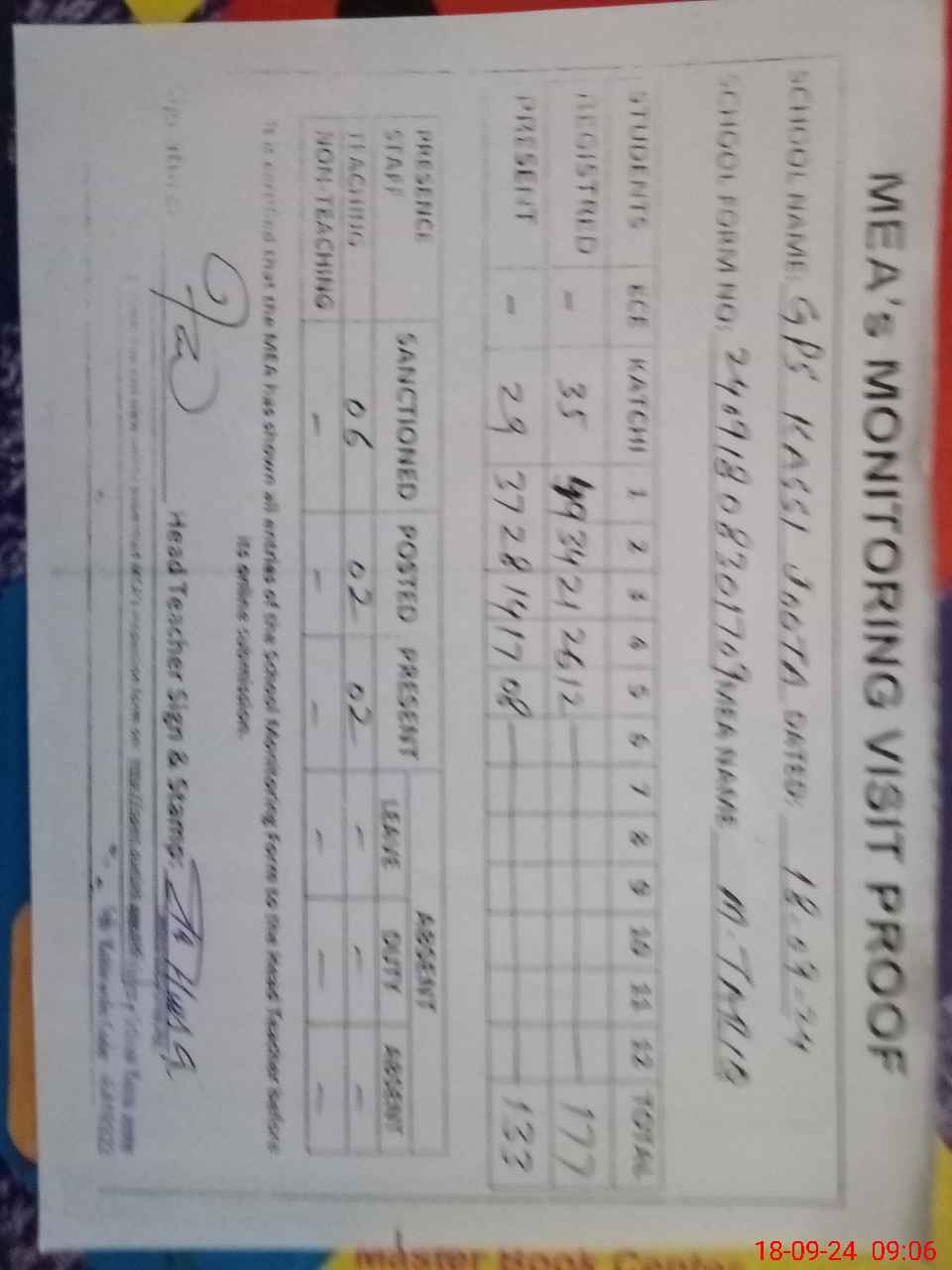 | Attendance Register | Head Teacher | MEA with School | Visit Proof |