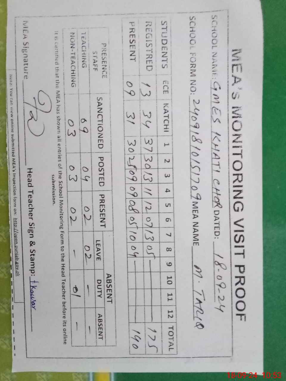 | Attendance Register | Head Teacher | MEA with School | Visit Proof |