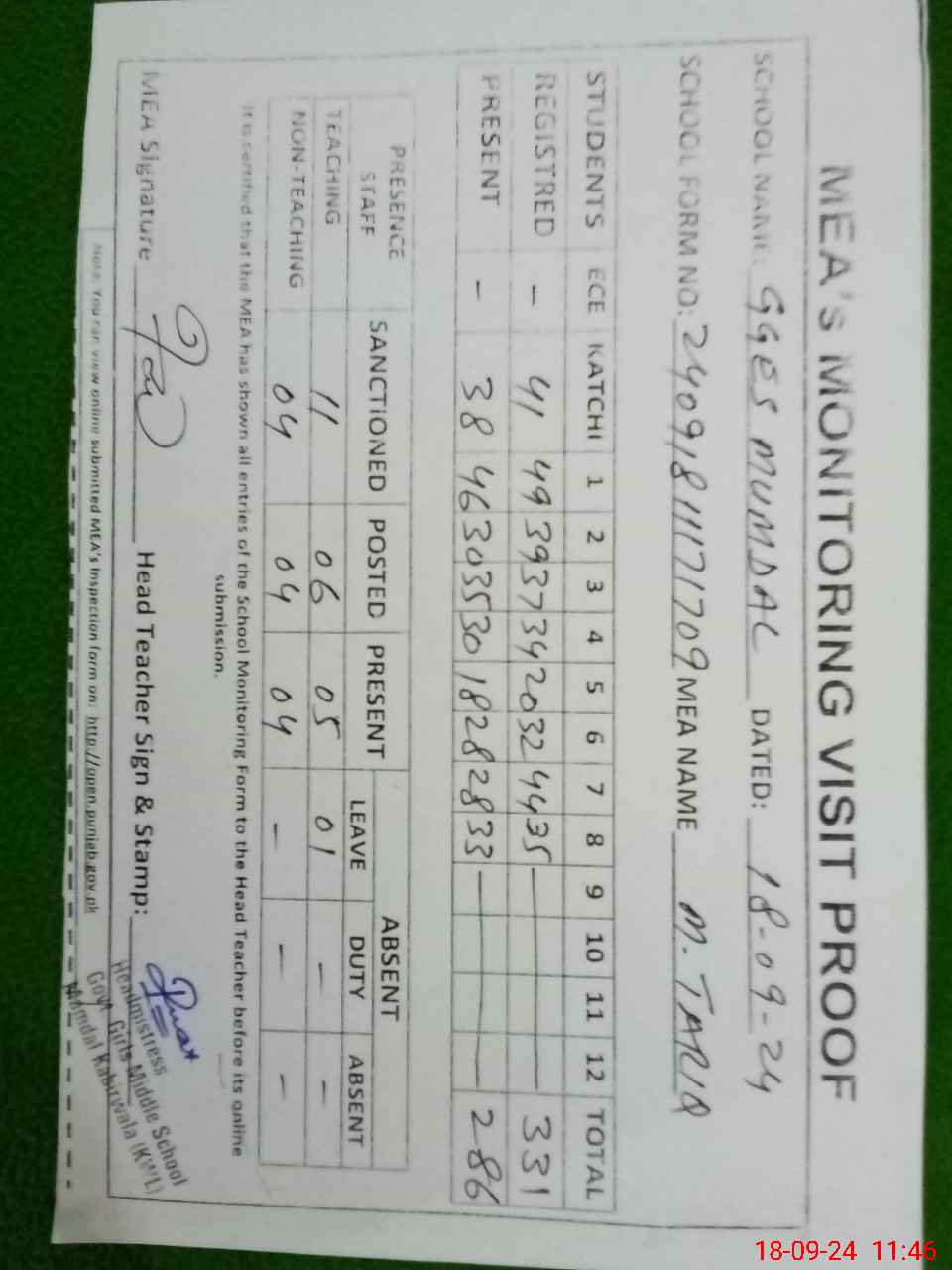 | Certified that this School was Inspected by the Undersigned MEA/DMO Today and the Information Stated Above is as Per Record. | |||||