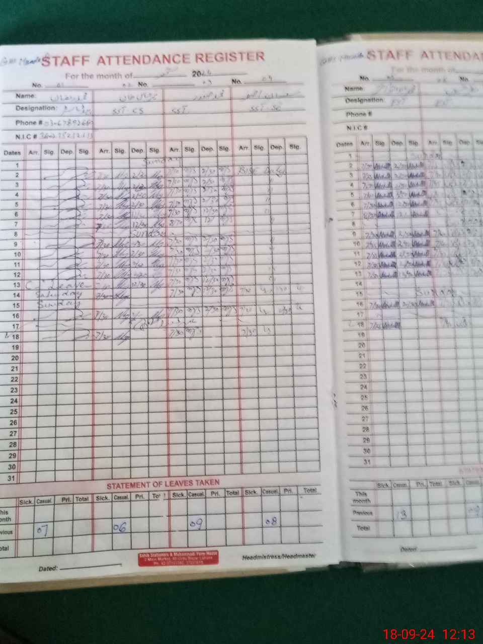 | CNIC | Full Name | Designation | R/C | Absence During Last Calender Month |