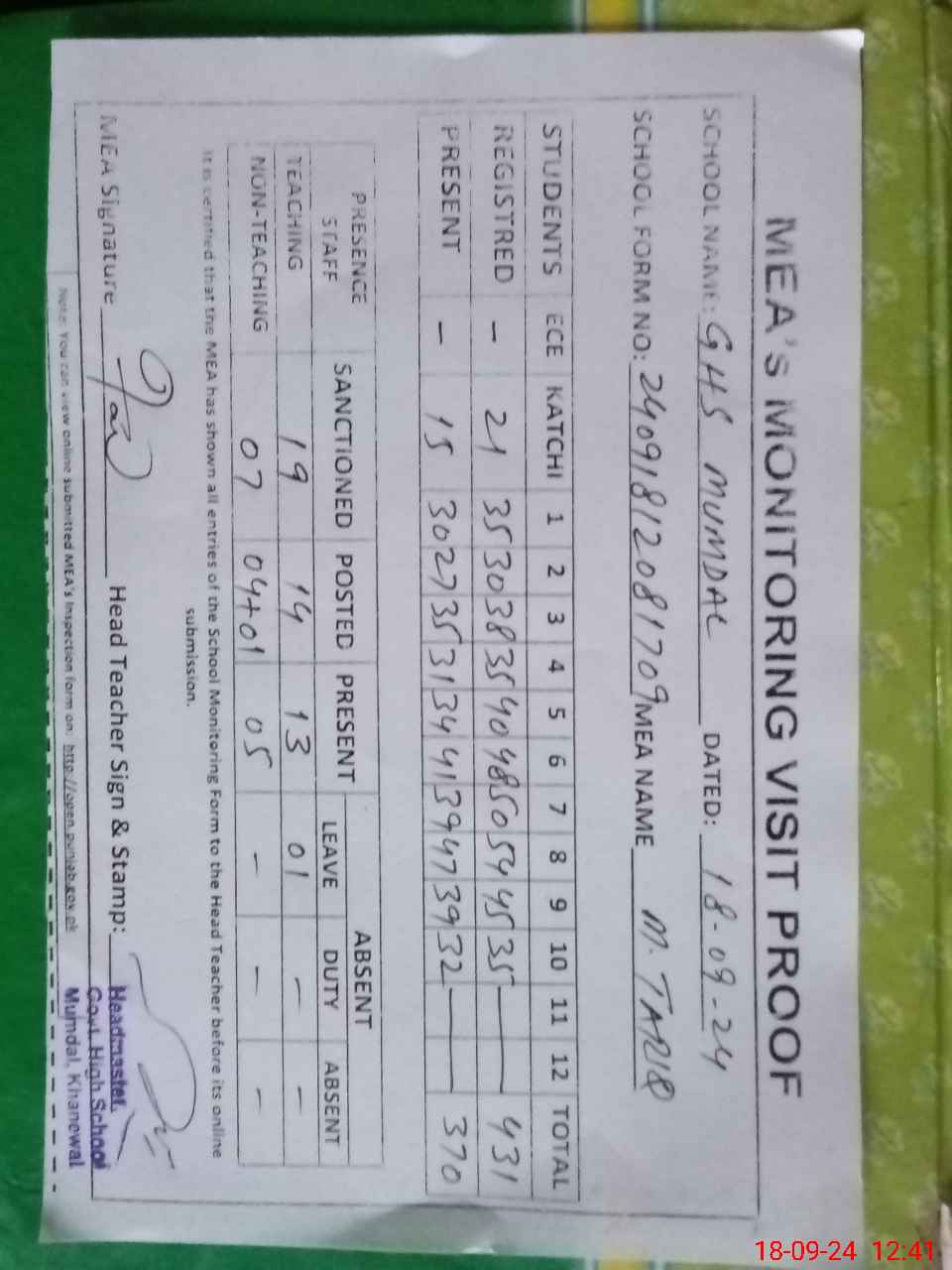 | Attendance Register | Head Teacher | MEA with School | Visit Proof |