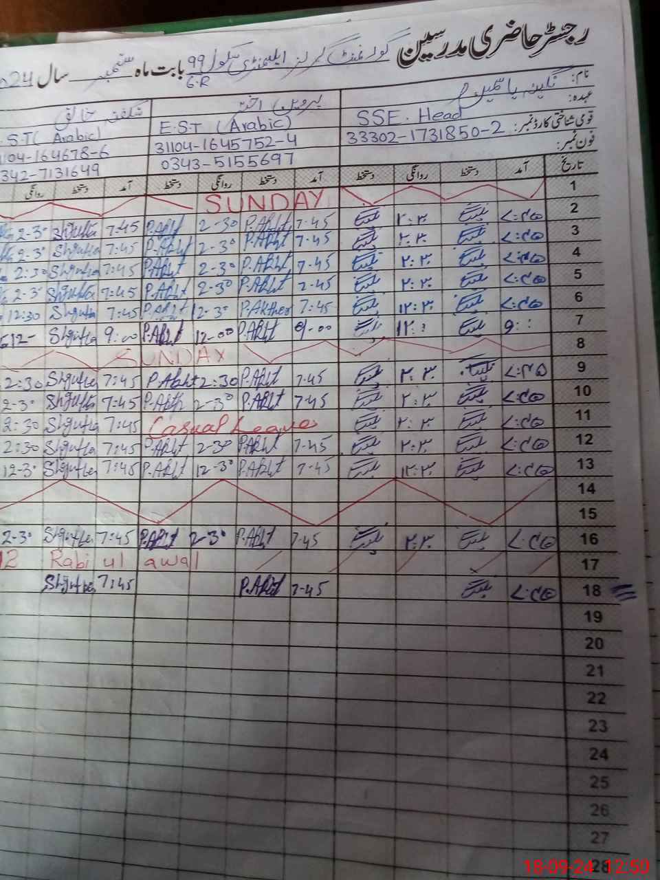 | CNIC | Full Name | Designation | R/C | Absence During Last Calender Month |