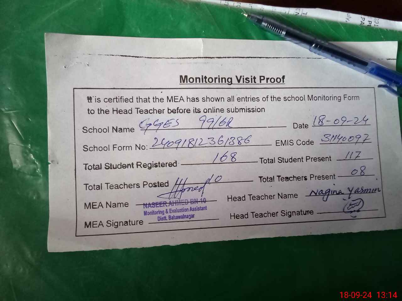 | Attendance Register | Head Teacher | MEA with School | Visit Proof |