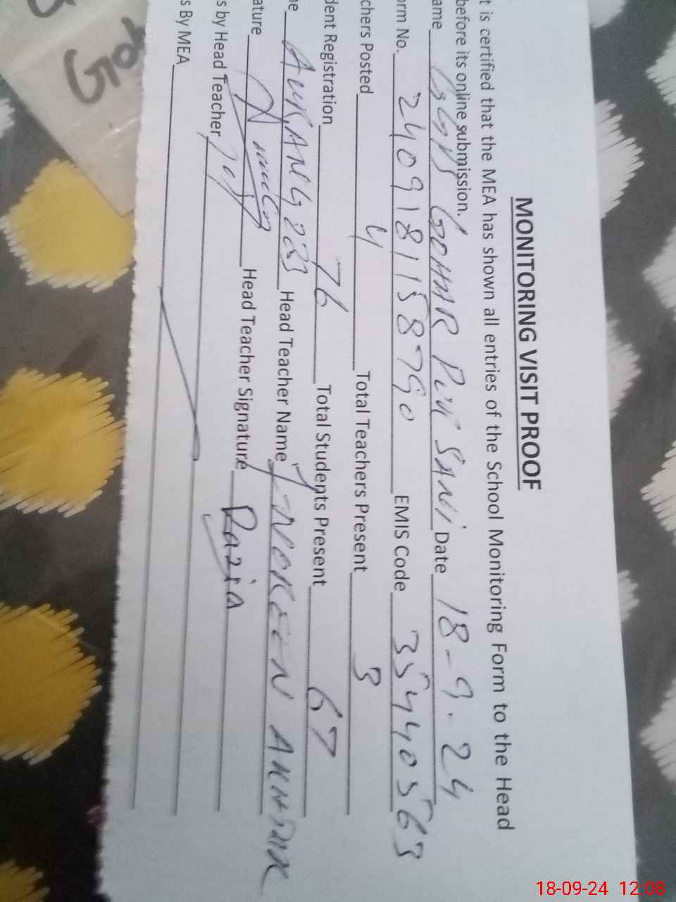 | Attendance Register | Head Teacher | MEA with School | Visit Proof |