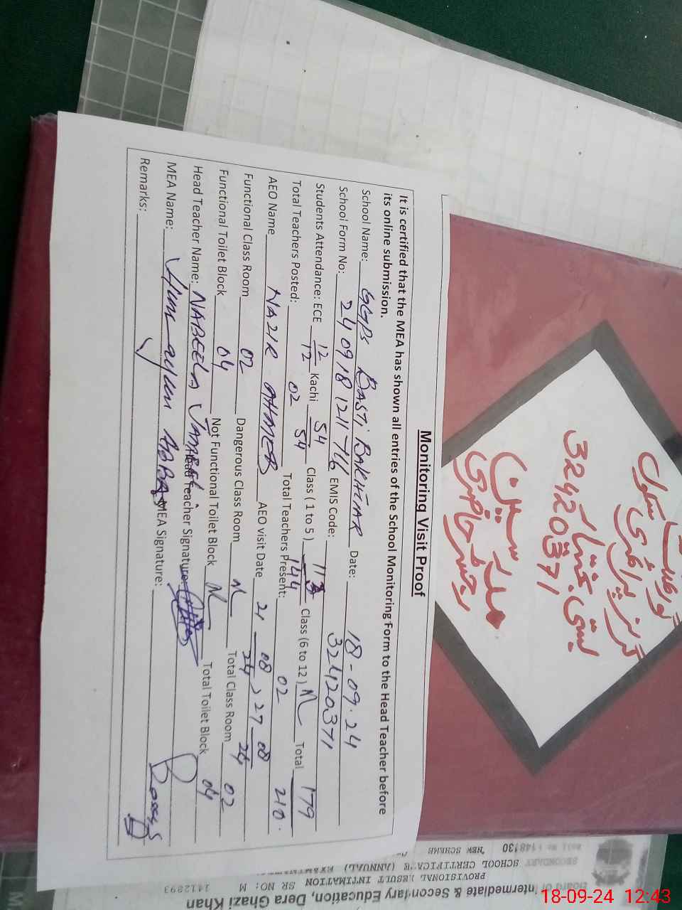 | Attendance Register | Head Teacher | MEA with School | Visit Proof |