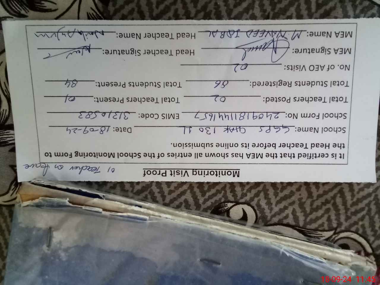 | Certified that this School was Inspected by the Undersigned MEA/DMO Today and the Information Stated Above is as Per Record. | |||||