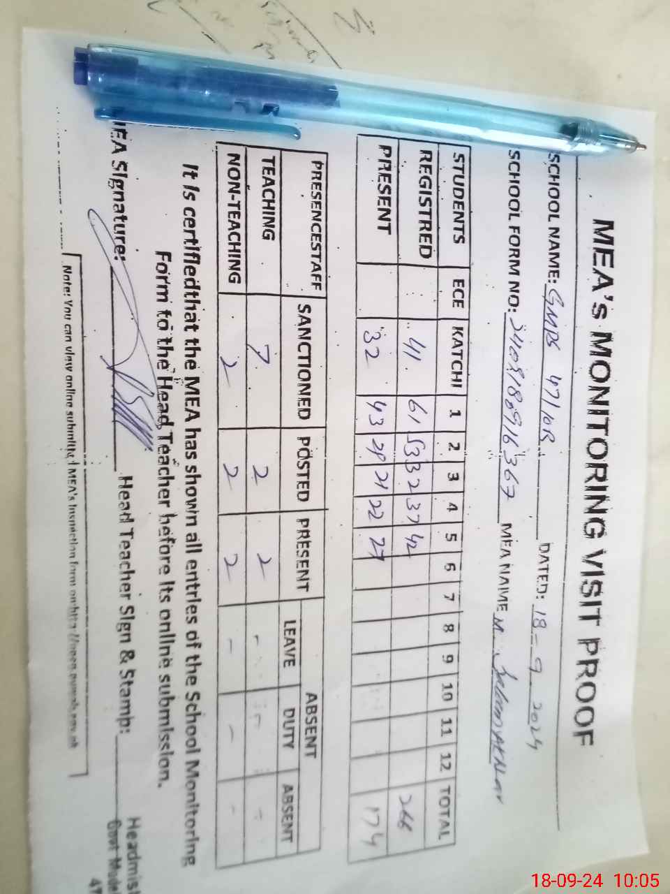 | Attendance Register | Head Teacher | MEA with School | Visit Proof |