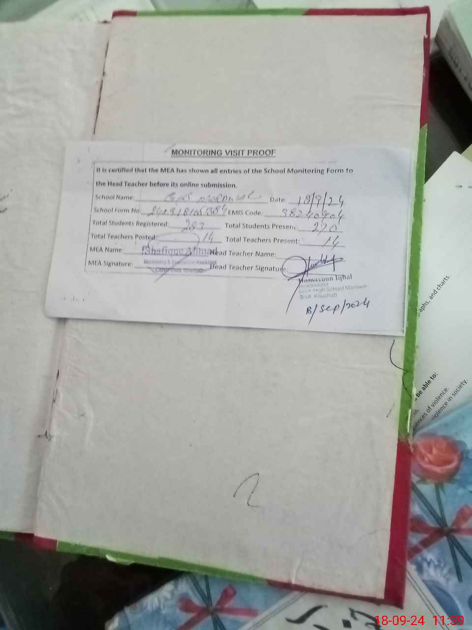 | Attendance Register | Head Teacher | MEA with School | Visit Proof |