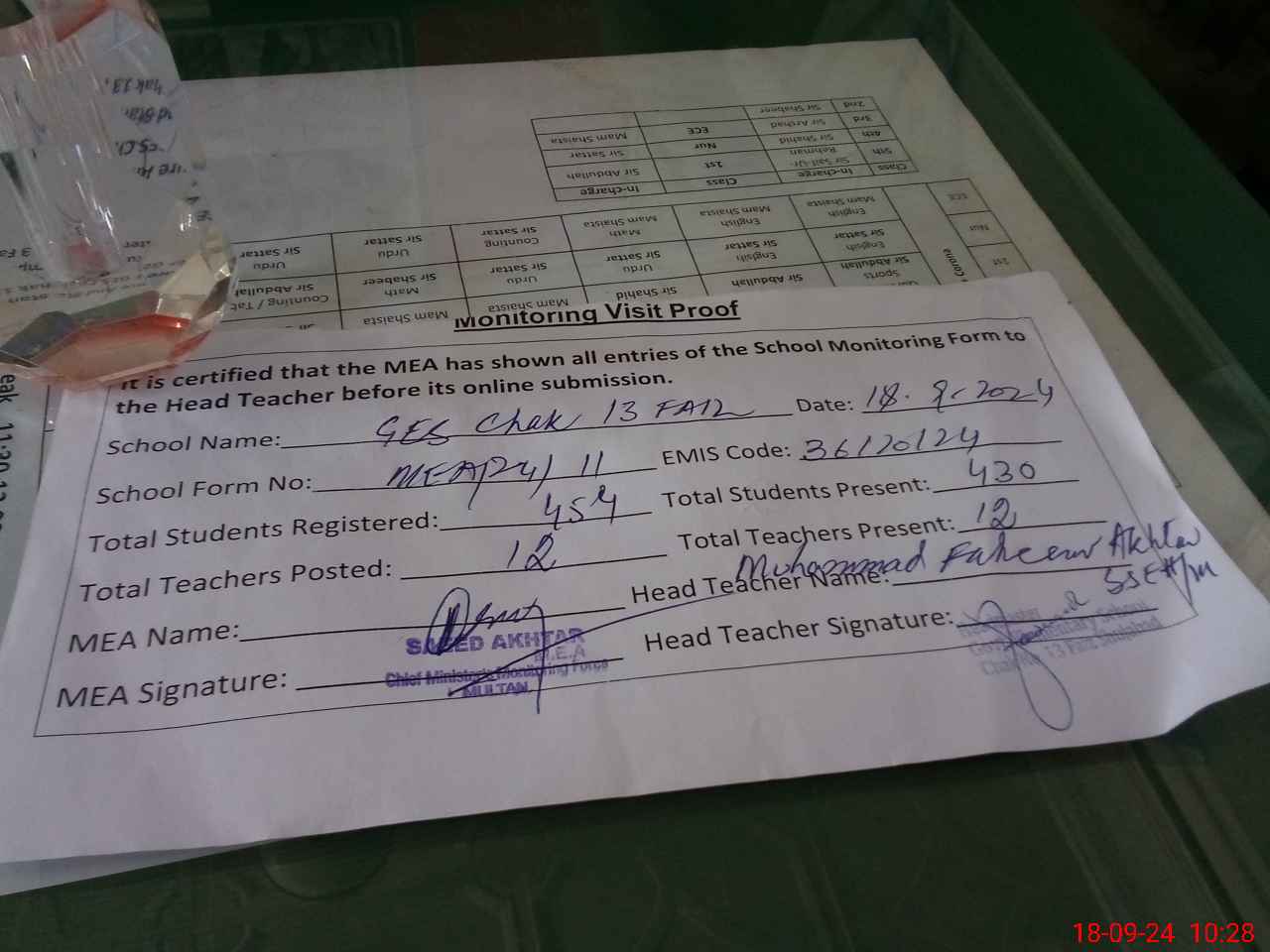 | Attendance Register | Head Teacher | MEA with School | Visit Proof |