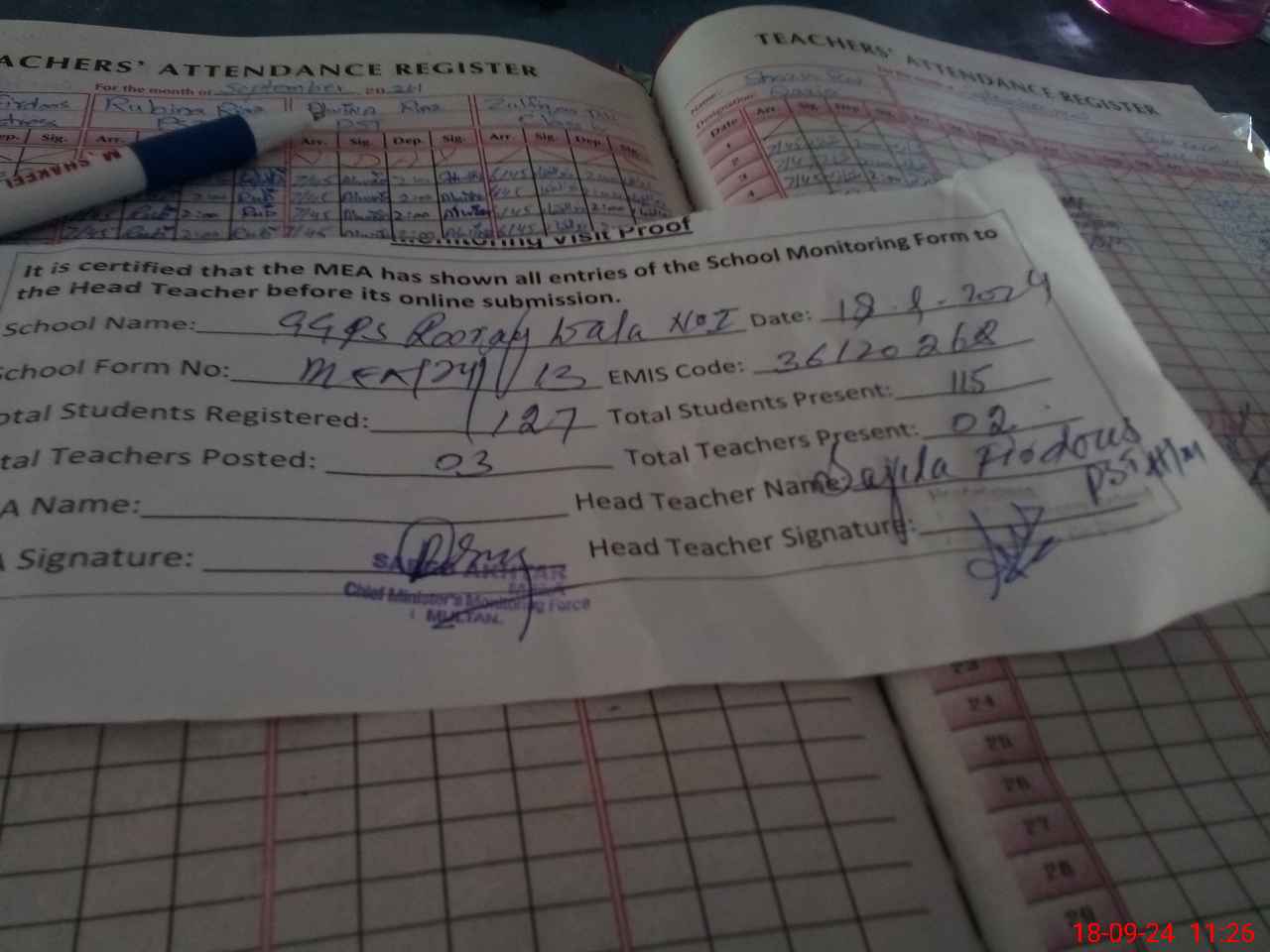 | Attendance Register | Head Teacher | MEA with School | Visit Proof |