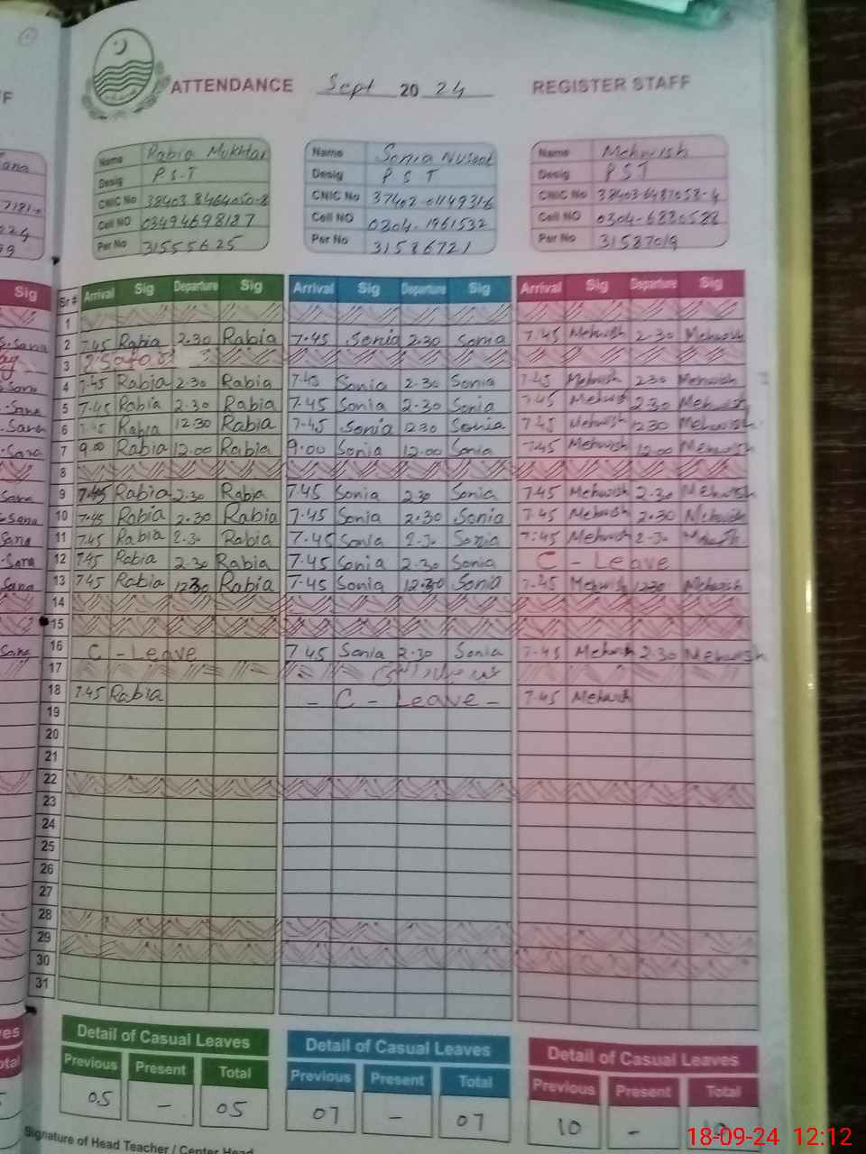 | CNIC | Full Name | Designation | R/C | Absence During Last Calender Month |