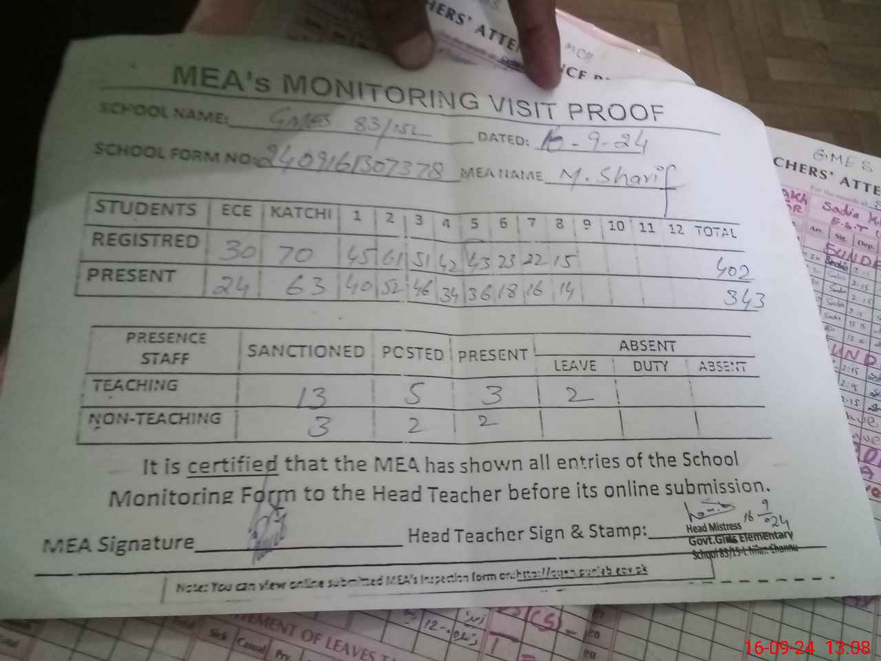 | Attendance Register | Head Teacher | MEA with School | Visit Proof |