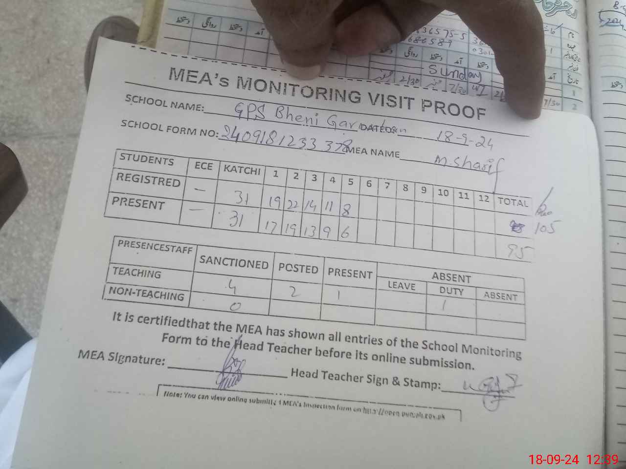 | Attendance Register | Head Teacher | MEA with School | Visit Proof |