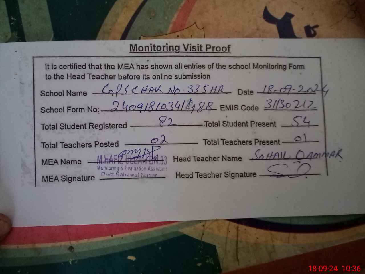 | Attendance Register | Head Teacher | MEA with School | Visit Proof |