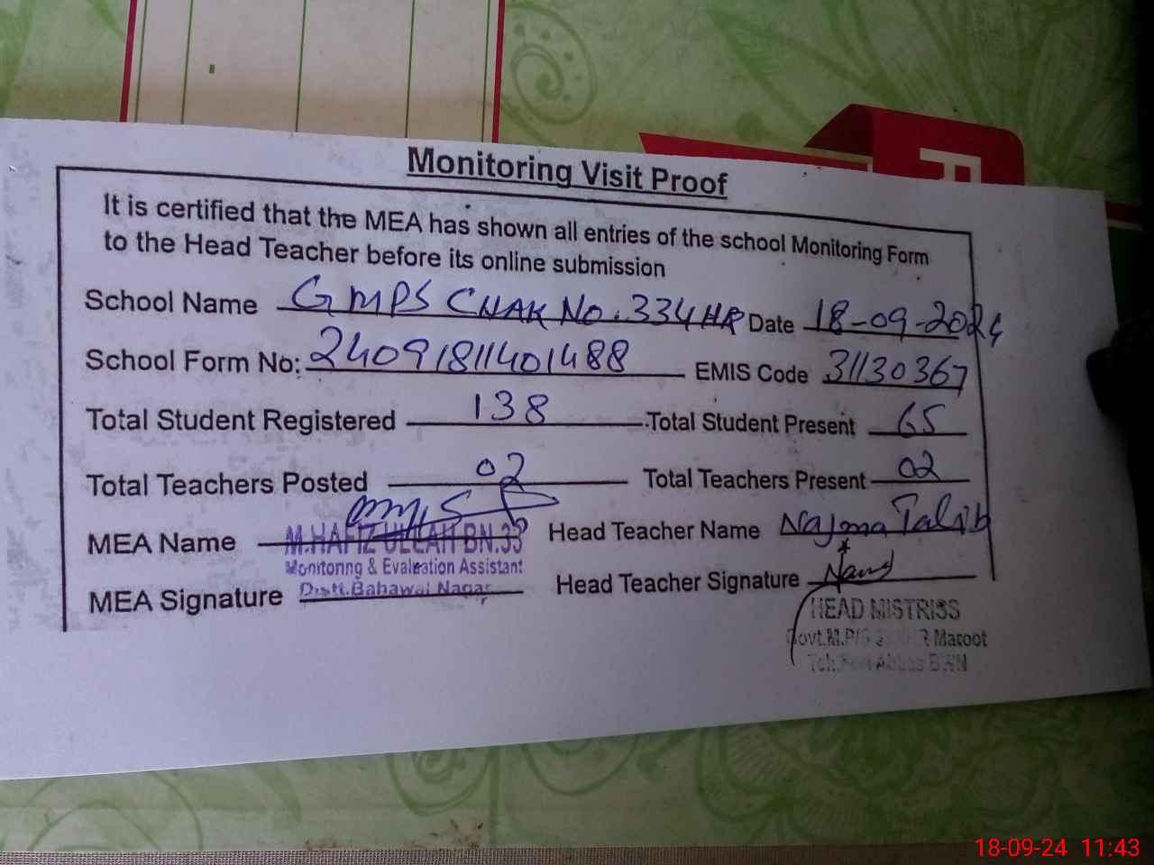 | EMIS Code: 31130367 | Name of School: GMPS CHAK NO. 334/HR | |||