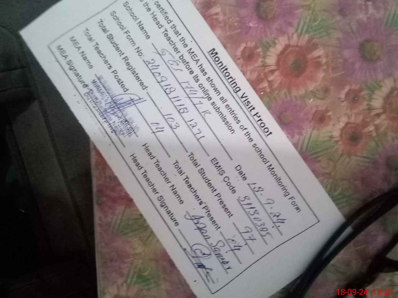 | Attendance Register | Head Teacher | MEA with School | Visit Proof |