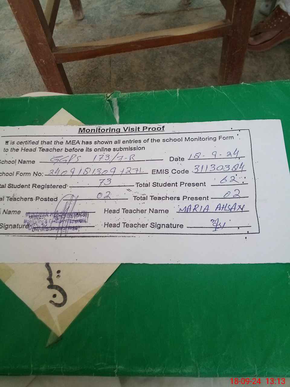 | EMIS Code: 31130384 | Name of School: GGPS CHAK NO 173/7-R E | |||