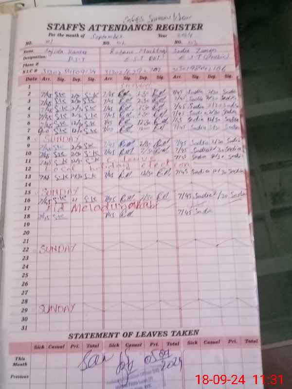 | CNIC | Full Name | Designation | R/C | Absence During Last Calender Month |