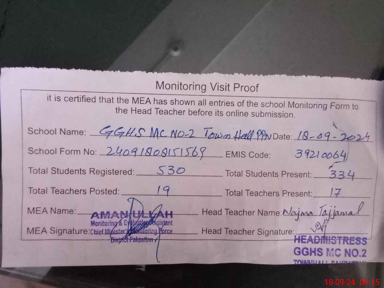 | Attendance Register | Head Teacher | MEA with School | Visit Proof |