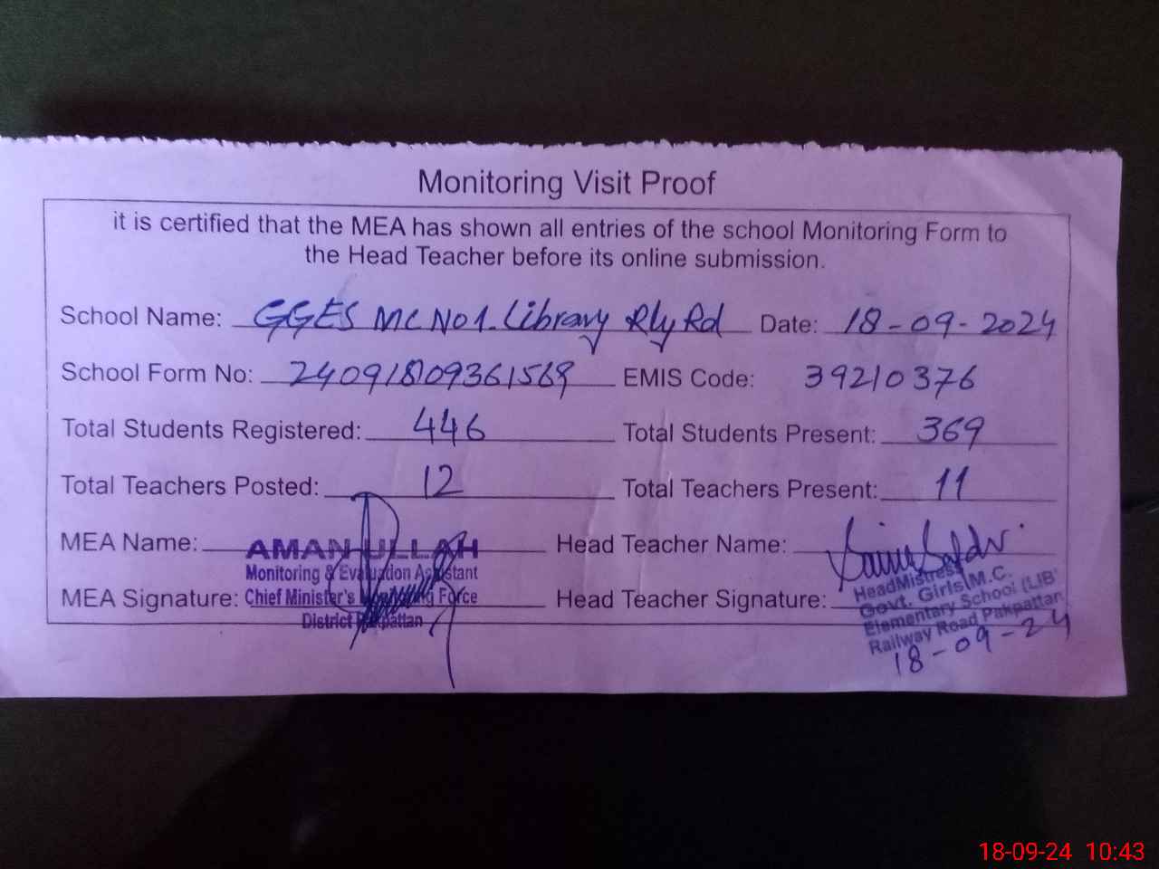 | EMIS Code: 39210376 | Name of School: GGES MC NO. 1 LIBRARY RAILWAY ROAD | |||