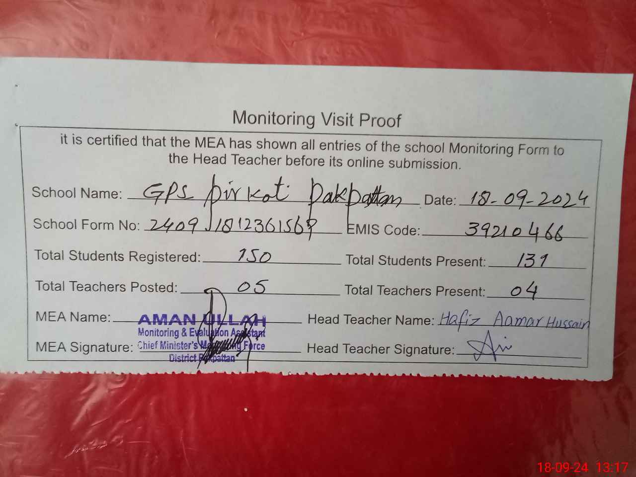 | Attendance Register | Head Teacher | MEA with School | Visit Proof |