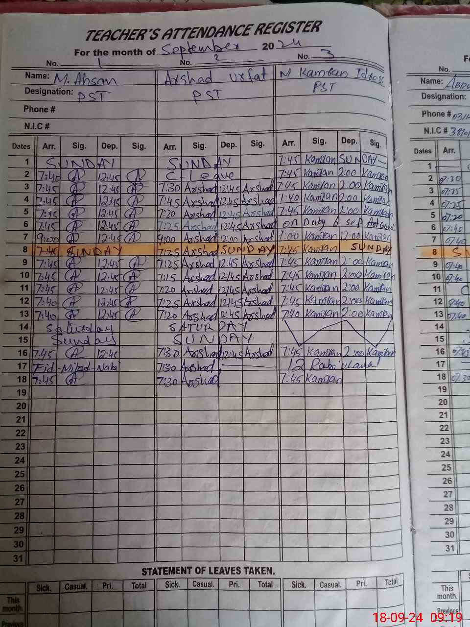 | CNIC | Full Name | Designation | R/C | Absence During Last Calender Month |