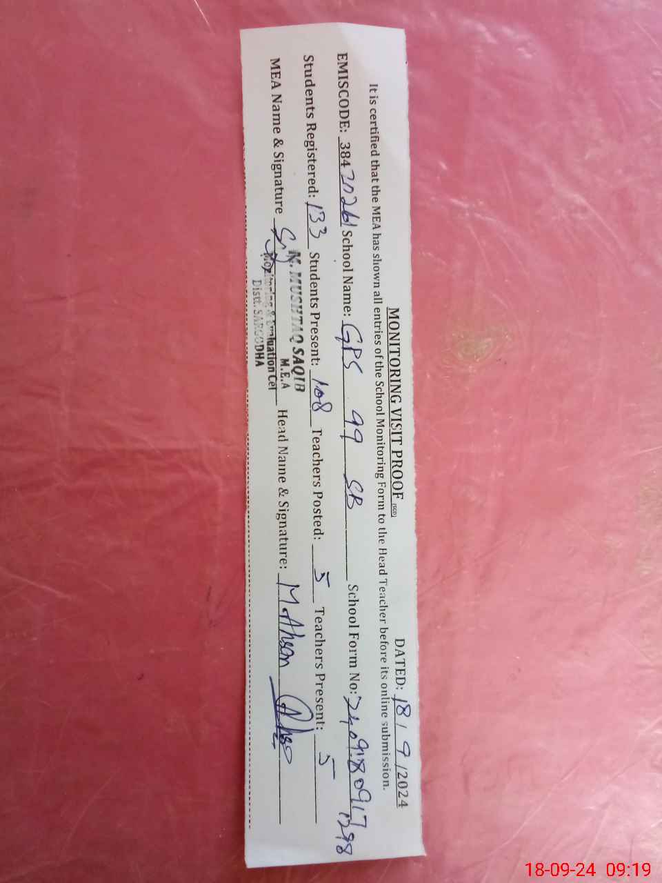 | Attendance Register | Head Teacher | MEA with School | Visit Proof |