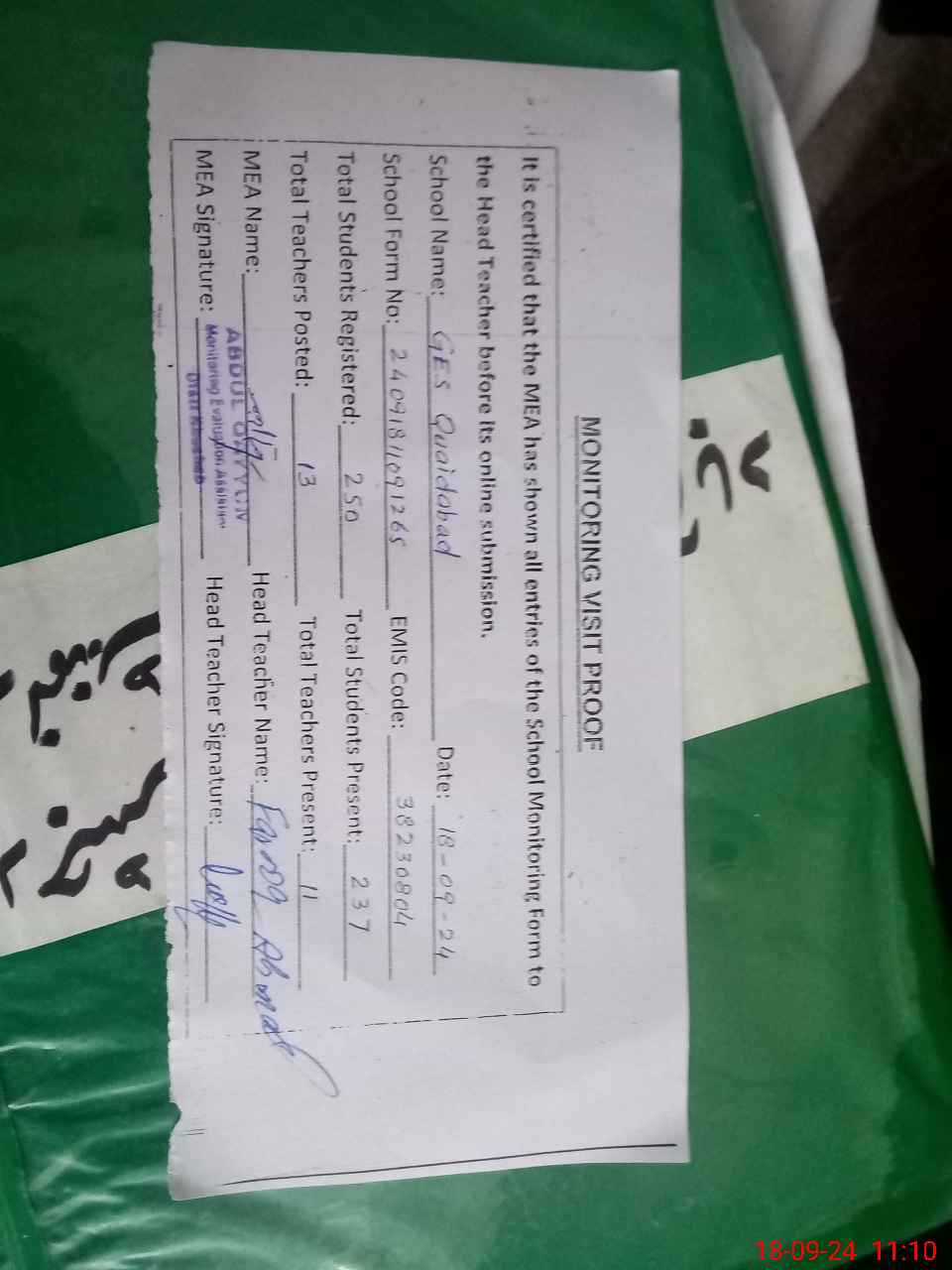 | Attendance Register | Head Teacher | MEA with School | Visit Proof |