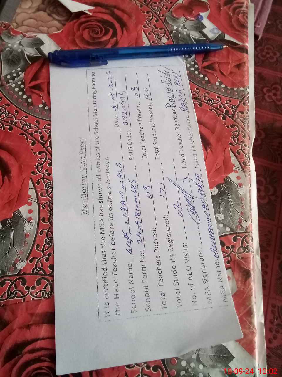 | Attendance Register | Head Teacher | MEA with School | Visit Proof |