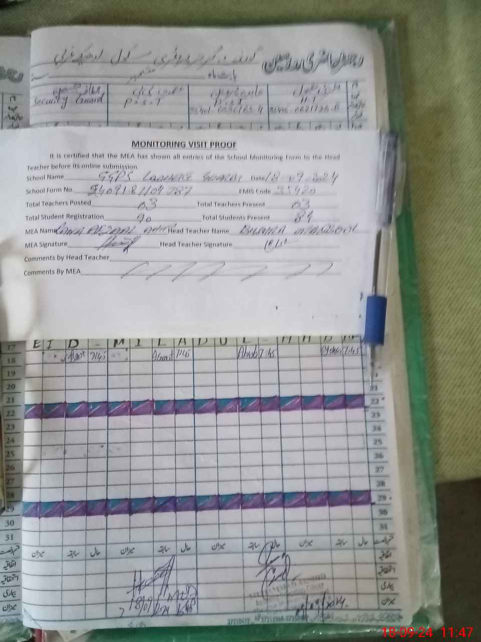| Attendance Register | Head Teacher | MEA with School | Visit Proof |