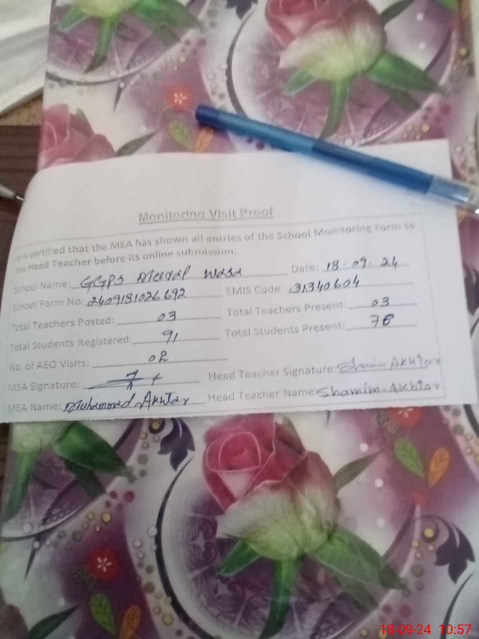 | Attendance Register | Head Teacher | MEA with School | Visit Proof |