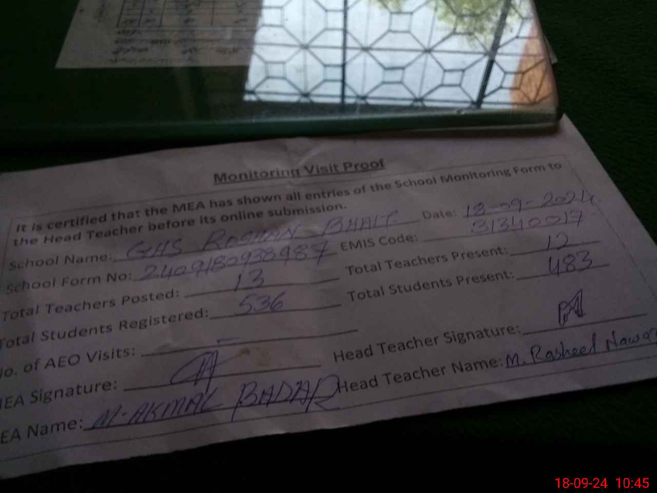 | Attendance Register | Head Teacher | MEA with School | Visit Proof |