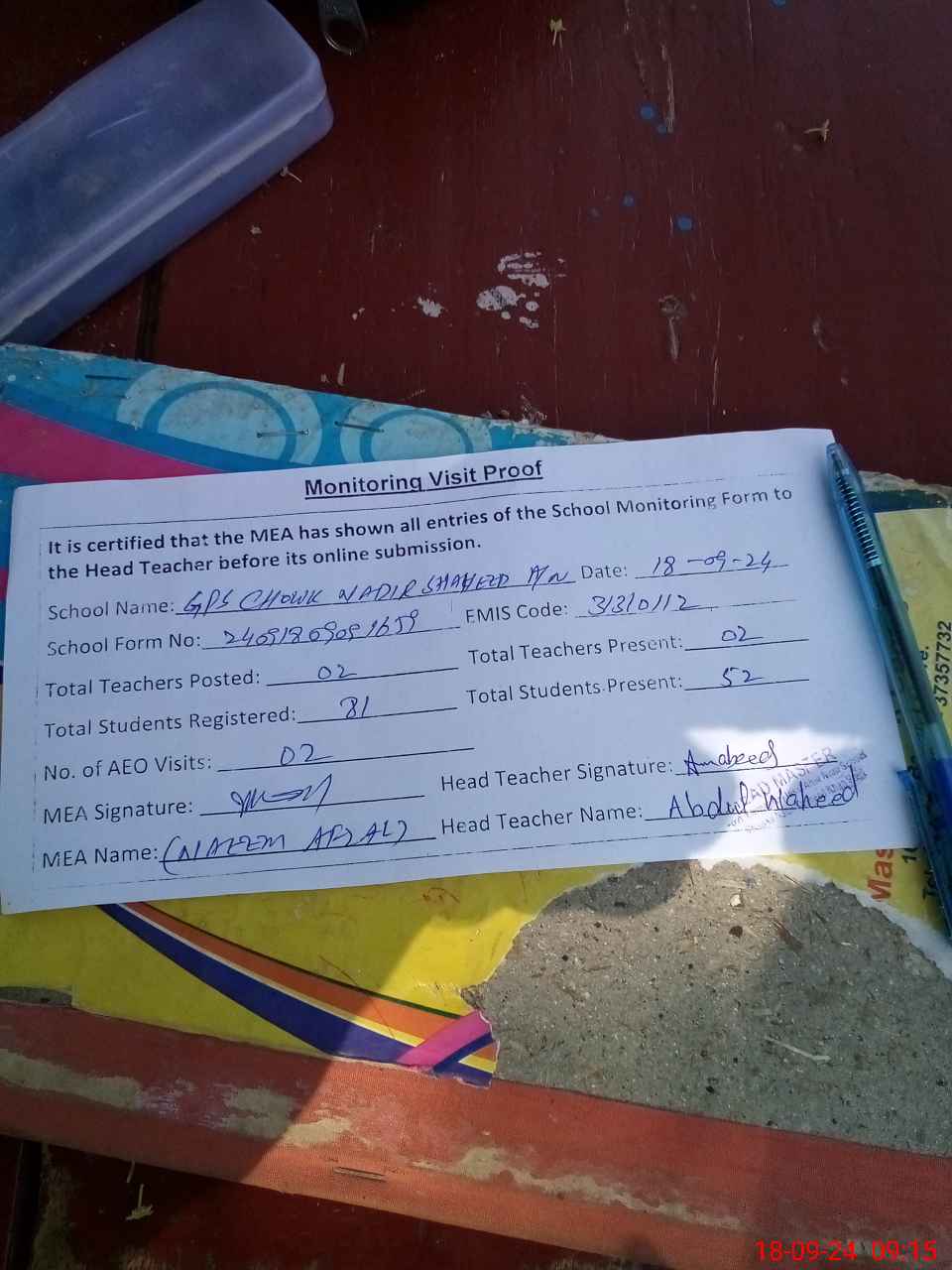 | Attendance Register | Head Teacher | MEA with School | Visit Proof |